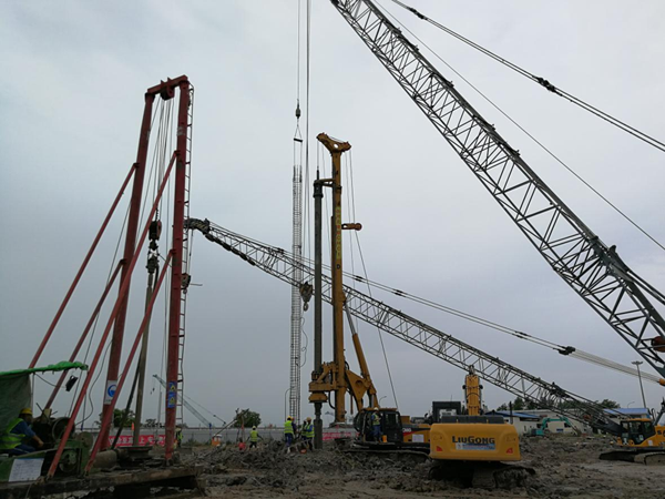 本項(xiàng)目施工高峰期投入150旋挖鉆機(jī)3臺(tái),GPS-10回轉(zhuǎn)鉆機(jī)5臺(tái),中方施工人員49人,緬方施工人員150人。本工程于2018年3月10日開工,9月02日竣工,共計(jì)177天,完成9個(gè)罐,直徑600mm樁基1250根,理論方量10650m³。整個(gè)施工期正值緬甸雨季,我公司克服種種施工困難,最終安全順利完成了總包方各個(gè)節(jié)點(diǎn)工期目標(biāo)。
