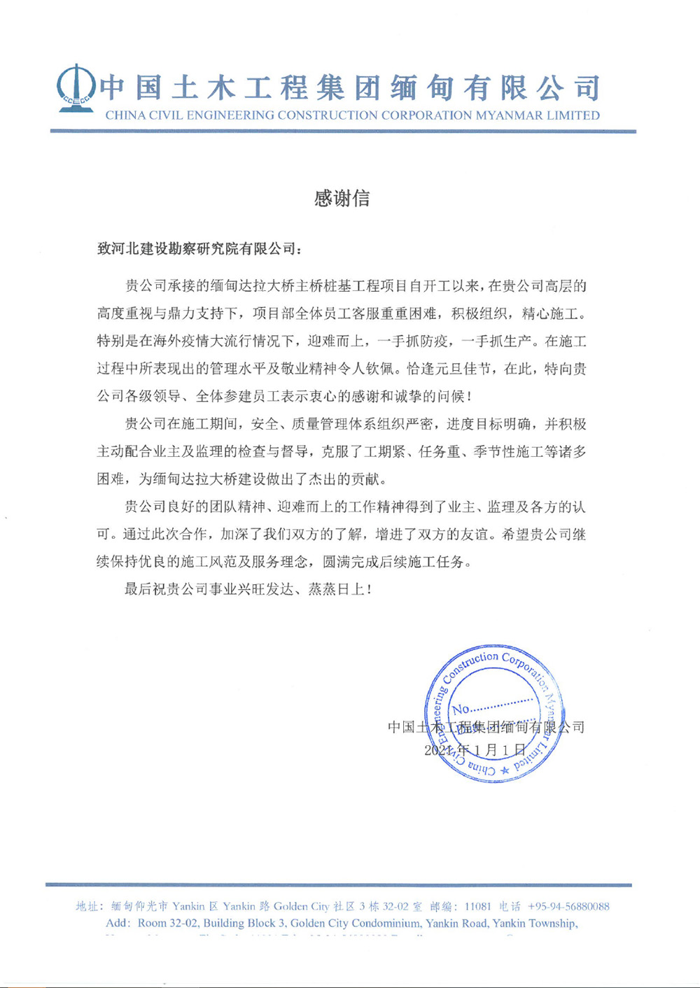 中國土木工程集團緬甸有限公司感謝我公司在緬甸達拉大橋主橋樁工程施工過程中,項目部全體員工迎難而上、一手抓防疫、一手抓生產,克服了工期緊、任務重、季節性施工等諸多困難,為緬甸達拉大橋建設做出了杰出貢獻。