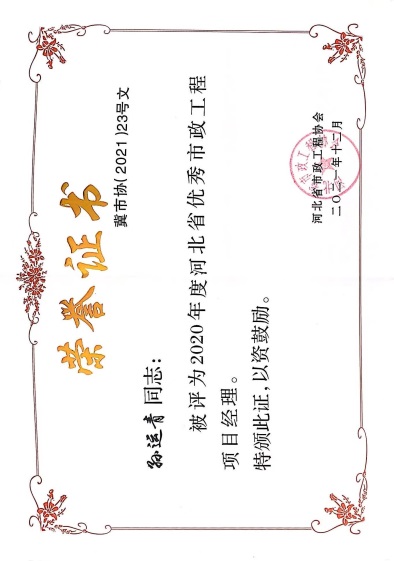 近日,由河北省市政工程協會評選,公司榮獲“2021年度河北省優秀市政施工企業”稱號;韓立君董事長榮獲“2021年度河北省市政行業優秀企業家”稱號;孫運青、狄艷林、高軍會、張海蛟四位同志榮獲“2020年度河北省優秀市政工程項目經理”稱號。