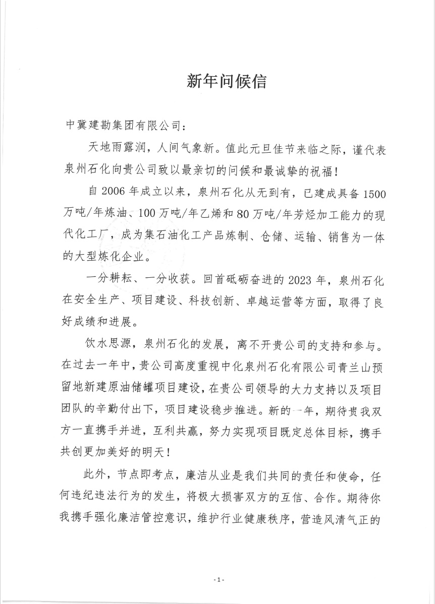 中化泉州石化有限公司為我公司發來了新年問候信,信中中化泉州石化有限公司肯定了我公司對中化泉州石化有限公司青蘭山預留地新建原油儲罐項目建設的重視;看到了我公司及項目施工人員為項目的辛勤付出;并期望在新的一年里加強合作,再創新業績。